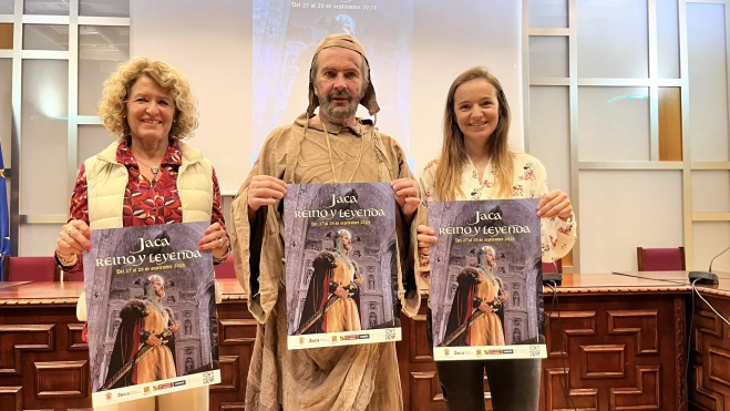 Jaca, Reino y Leyenda regresa del 27 al 29 de septiembre con un programa de actividades que en esta segunda edición que incluye varias novedades explicadas este miércoles en el Salón de Ciento del Ayuntamiento de Jaca por la concejal de Turismo y promoción, Lucía Guillén, y la directora de la Oficina de Turismo, María José Jarne. El actor y guionista de estas jornadas, Toño L´Hotellerie, ha sorprendido interpretando un fragmento del monólogo ‘Bernard, El Cantero’, que tendrá lugar el sábado 28 a las 12.30 en la plaza Ripa.