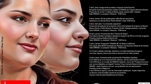 Como resulta ya habitual desde hace casi 20 años, la cita del mes de abril del republicanismo oscense llega a su edición número 17, interrumpida tan sólo en tiempos del Covid. Para este año, y como suele ser habitual en la cartelística de la fecha, se elige la foto de una mujer destacada en su defensa por los valores republicanos, mostrándose, junto a su imagen, el programa de actos. En esta ocasión, la imagen electa ha sido la de las hermanas Oliver Borja (Mirian y Noemí) que han acompañado en muchas ocasiones actos del CRMAHU. Por ello y por su pertenencia al colectivo ciudadano gitano de la ciudad en el sexto centenario de su llegada a tierras aragonesas.