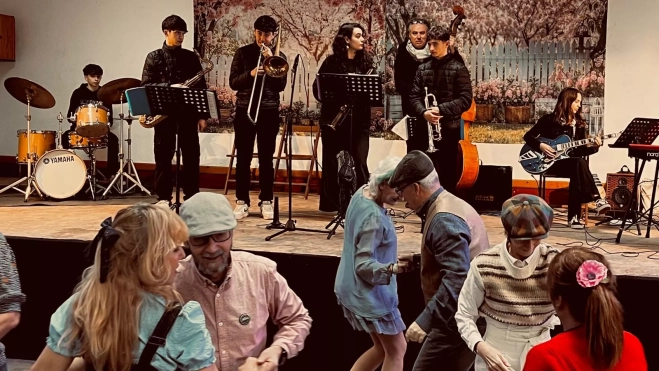 El swing de la Sedajazz Kids Band movió a las once parejas de la Huesconswing Hepcats que se desplazaron, algunos ataviados con galas de época, para llenar de agilidad, movimiento, ritmo y destreza el salón de Novales, recreando un ambiento próximo al original e inspirador de los felices y locos años veinte.