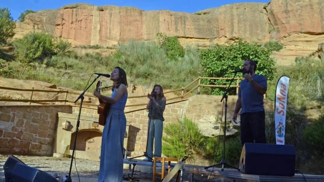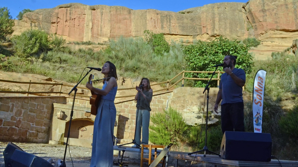 Acompañada de dos coristas, alternando guitarra y pandero, y sin más aditivos para su voz aterciopelada y melódica, Judit Neddermann impregnó de sensibilidad y armonía un espacio recoleto e idílico en las cercanías de Fraella, pedanía del municipio de Grañén: la fuente de los Recuerdos, desenterrada y recuperada por sus vecinos como espacio público hace menos de una década.