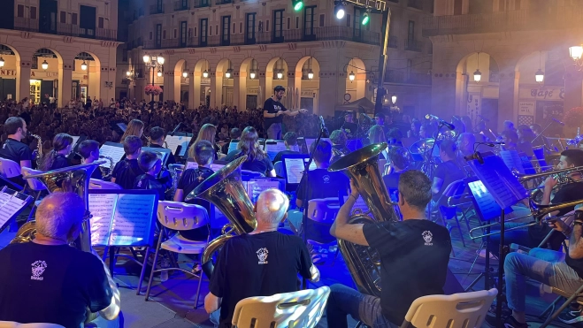 La plaza López Allué se ha convertido esta noche en un gran escenario musical y solidario de Huesca, gracias a un fantástico concierto de la Banda de Música de Huesca, bajo la dirección de Alejandro Escuer y la participación de tres voces excepcionales, las de Rubén Correia, Antonio Pertusa y Lorena Mata.