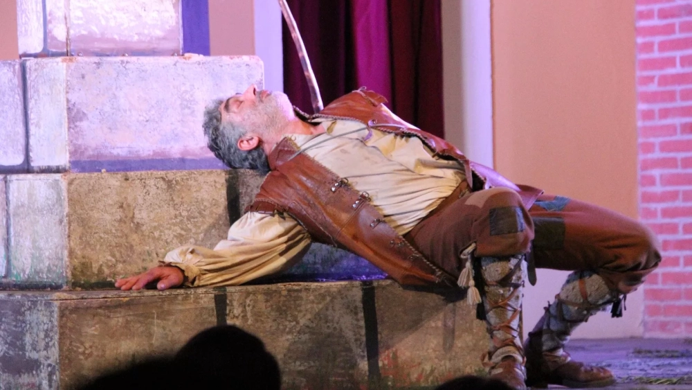 Hoy hemos asistido al derrumbamiento total de la misma. El Corral de Comedias de Robres se ha transformado, gracias a la magia del teatro, en una plaza castellana donde hemos podido asistir al relato vital de un hombre al que hemos sentido como un compañero de viaje y penalidades con el que la complicidad, la compasión a veces, y el sentido del humor en todo momento salpimentado con momentos de matizado pesimismo. Un hombre contando su historia y un grupo de amigos (el público) jaleando sus breves momentos de victoria, lamentando sus hambres de todo tipo y alegrándose de su final tan de superviviente conformista que vive como broche final un empleo que le permite comer crónicamente.