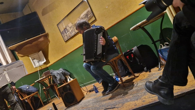 El acordeonista Javier López Jaso, el contrabajo Marcelo Escrich y el saxofonista Mikel Andueza presentaron "Inmarcesible Zimelezín", en la emblemática sala oscense, con muy buena entrada de un público que se mostró reacio a que finalizase la velada y pidió que se alargara el repertorio.