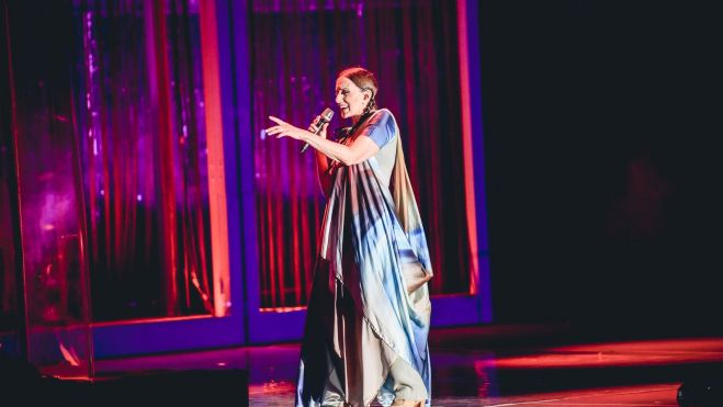La artista coruñesa, que recibió el viernes el IX Premio Pirineos Sur ‘Cultura e integración’ por su compromiso humanitario y social a través de la música, apostó desde el comienzo por su vigoroso presente, su decimosexto trabajo de estudio, con la delicada “Las ventanas de mi alma” y la potente “La inocencia”. La gallega comenzó el recital parapetada tras una cortina de hilos que funcionaban como pantalla para las proyecciones. Un arranque sobrio e íntimo que pronto mutó en un enérgico directo y un público totalmente entregado a la artista.