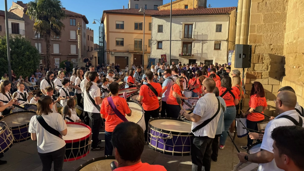 El encuentro ha sido seguido por numerosos vecinos y visitantes y también por la alcaldesa, Patricia Rivera, y la concejal de Cultura, Beatriz Oliván, que han recibido a su vez el obsequio de la Asociación de Bombos y Tambores de Binéfar.