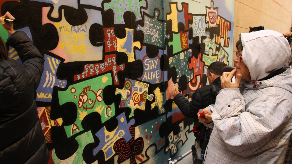 La idea idea del mural colaborativo, como ha explicado el artista oscense, arrancó el año pasado, de una propuesta de Alejandro Santolaria, Jano. Después le plantearon la posibilidad y Hatake se puso a realizar los bocetos. Junto a los representantes de Cadis Huesca, de las asociaciones y los usuarios, se consiguió que las piezas fueran encajando en el puzzle. Un símil muy adecuado "para hablar de inclusión, de diversidad y de personas con discapacidad", ha observado.