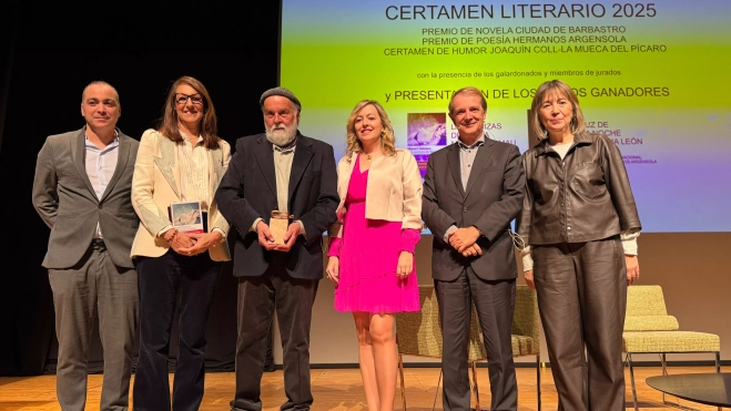 El Auditorio del Centro de Congresos ha acogido este 20 de diciembre el acto de entrega de los Premios del Certamen Literario 2025 y la presentación de ‘Las cenizas de Berta’ de Miguel Dalmau, la novela ganadora del LVI Ciudad de Barbastro y ‘Luz de la Noche’, el poemario de Victoria León Varela distinguido con el LVII Hermanos Argensola y presentado en origen bajo el título ‘Memoria del Futuro’. Elena Bethencourt ha recogido el Premio de Relato de Humor Hiperbreve Joaquín Coll-La Mueca del Pícaro.