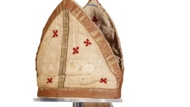 La mitra es un tocado litúrgico, distintivo de los obispos, desde que Inocencio II impusiera su uso como tal. A algunos abades que gozaban de una dignidad especial –abades mitrados–, se les concedía el derecho a llevar algunas insignias propias de los obispos, como el báculo, las sandalias, los guantes, el anillo o la mitra: es el caso del abad del Monasterio de San Victorián, al que pertenece esta pieza.