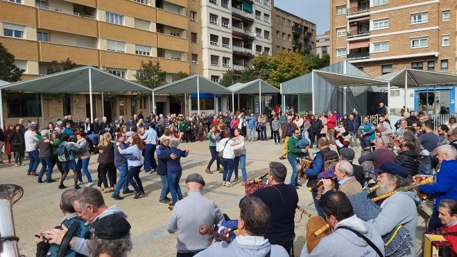 Además de los músicos, los Gaiteros del Rabal han acudido a este acto con sus bailadores, a los que se han sumado muchos oscenses que se han dejado llevar por la música y el gran ambiente que se ha generado en la plaza de San Antonio en una mañana para preservar y compartir la música tradicional.