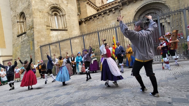 La comitiva ha culminado en la emblemática plaza López Allué, tras recorrer el Coso hasta la calle Ramiro el Monje y la plaza de San Pedro, donde se le ha hecho pasillo a Estirpe de Aragonia, que ha bailado ante el monasterio. Después, los Danzantes de Yebra han sido los primeros en subirse al escenario para representar sus tradicionales mudanzas, finalizando con "La liebre", su danza más espectacular y aclamada.