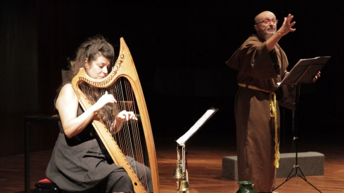 Gonzalo de Berceo, primer poeta conocido en lengua castellana, volvió a las tablas ocho siglos después. Uno de los mayores exponentes del Mester de Clerecía se presentó antes de las fiestas oscenses con una selección de sus ‘Milagros de Nuestra Señora’, “en la que apreciamos que la condición humana apenas se ha movido del sitio; que seguimos necesitando pensar que no todo está perdido; que en las peores circunstancias podemos seguir confiando; que la poesía y la música son una balsa en medio del naufragio; y que, en definitiva, a través ambas y de la belleza que desprenden sigue siendo posible la esperanza”, apuntan con tino arpista y actor.
