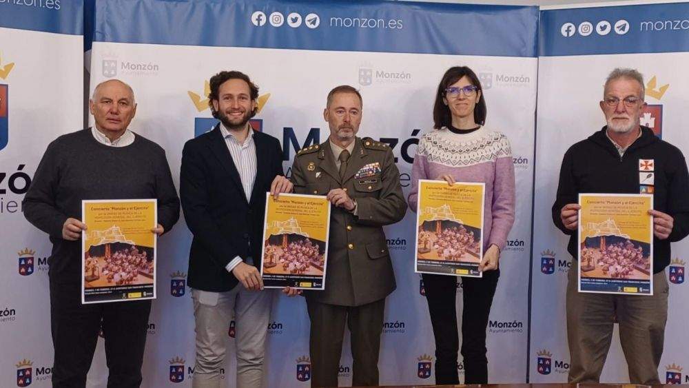 La Unidad de Música de la Inspección General del Ejército actuará el próximo 3 de febrero en Monzón, en la gala organizada por el Ayuntamiento para la entrega de los premios Monzón Extiende Cultura. La cita, a las 19 horas en el Auditorio San Francisco, ha sido presentada este lunes por el alcalde de Monzón, Isaac Claver, la concejala de Cultura, Nuria Moreno, el coronel de la Subdelegación de Defensa en Huesca, Rafael Matilla, y los premiados Carlos Ansaldo y Roberto Alquézar (como presidente de Sonus Venti).