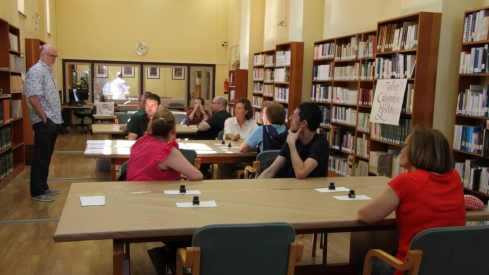 En Huesca, ha sido Ricardo Vicente la persona encargada de romper el hielo con un taller basado en caligrafía renacentista. Conviene recordar que Ricardo Vicente es calígrafo y se ocupa de encargos en su estudio AULARIUM, en Binéfar. Acude como profesor de caligrafía a centros educativos, museos y bibliotecas, y también asiste a ferias de oficios y de artesanía, educativas y festivales de recreaciones históricas, entre otros.