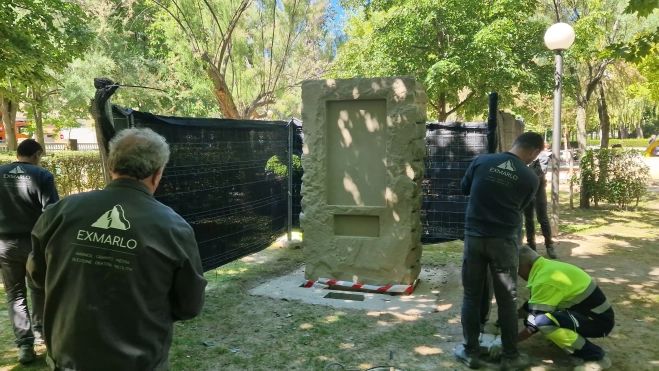La piedra que acogerá la escultura del artista oscense Javier Sauras, proveniente de la cantera de Uncastillo y meticulosamente preparada, ha sido finalmente instalada en su emplazamiento definitivo, dando paso a lo que pronto será el Rincón Orwell del parque Miguel Servet.