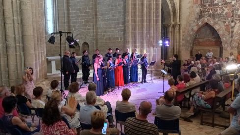 Los últimos en llegar no solo se mojaron con las gotas de una nube tormentosa soltó sobre Foces, sino que hubieron de seguir la actuación de Frumentum de pie. Cuando empezaron a sonar las quince voces mixtas que entonaban el “Ave verum corpus” de William Byrd doscientas treinta y cuatro personas, la tercera ocasión que se supera la frontera de los doscientos espectadores en esta undécima edición del Festival de Música y Patrimonio EnClaves que organiza la Comarca Hoya de Huesca|Plana de Uesca.