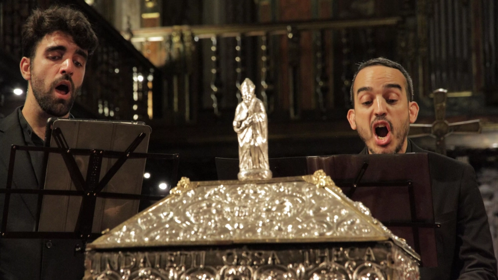 Un acercamiento al monasterio de San Juan de la Peña al recrearse la Liturgia de las Horas en un día tan importante para el monasterio pinatense, la celebración del traslado de las reliquias de San Indalecio desde Urci, Almería, al santuario pirenaico. Sonaron las antífonas y responsorios de maitines, laudes y vísperas compuestas para esta festividad, cuyos textos y melodías muestran la devoción y la importancia del hecho. Además de ser una recuperación del patrimonio musical medieval oscense, el hecho de que se conserven las reliquias del santo bajo el altar de la catedral lo hizo todavía más especial e intenso.
