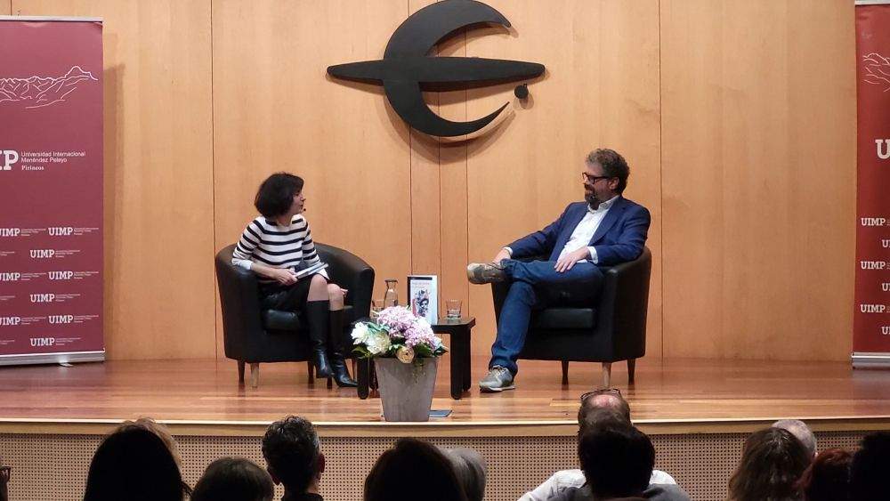 La politóloga montisonense Carmen Lumbierres le ha acompañado este miércoles en el Centro Cultural Palacio Villahermosa, donde han dialogado sobre este libro, en un acto enmarcado en la actividad que desarrolla la Universidad Internacional Menéndez Pelayo.