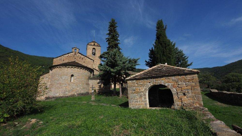 Se trata de un importante exponente del arte románico del Alto Aragón, datado en el siglo XII, con una nave única, presbiterio y ábside semicircular, conjunto al que en el siglo XVI se adosaron dos capillas laterales, la sacristía y la torre en el lado septentrional, así como otra capilla y el pórtico en el lado meridional en el siglo XVIII.