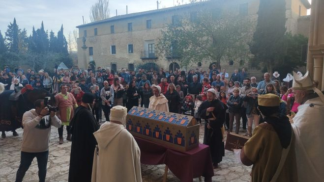El acto ha consistido en la llegada a Sijena de los restos del rey junto con los de sus caballeros, que habían muerto con él en Muret, y que quedaron enterrados en las cercanías de la portada del monasterio, y ha sido, “el punto estrella” de este este fin de semana de recreacionismo en el monasterio. “Es un conocimiento de la historia desde un punto de vista muy directo y espectacular”, ha apuntado Menjón.