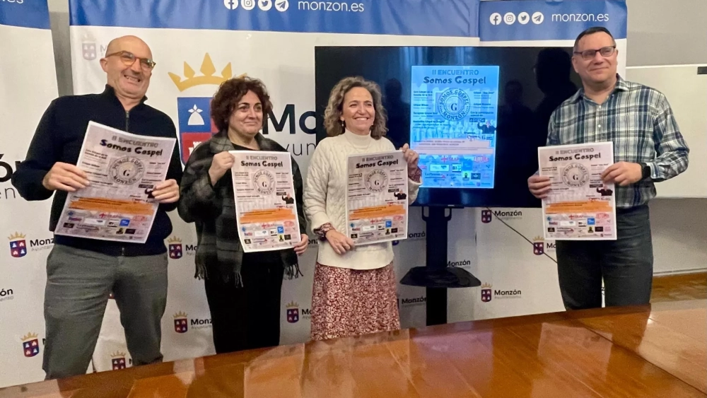 La concejala de Cultura, Marta Montaner Durán, la directora de Góspel Monzón, Virginia Varela, y los directores de la Escuela de Música Moderna de Monzón (EMMMO), Jacinto Cónsul y Javier Pérez, han presentado la cita este jueves. Montaner ha destacado que “este segundo encuentro ha crecido mucho con respecto a la primera edición con más grupos y más voces, así que agradecer el trabajo del coro góspel y la EMMMO para que esta iniciativa la podamos disfrutar en nuestra ciudad, que es ya es un éxito visto lo rápido que se acabaron las entradas”.