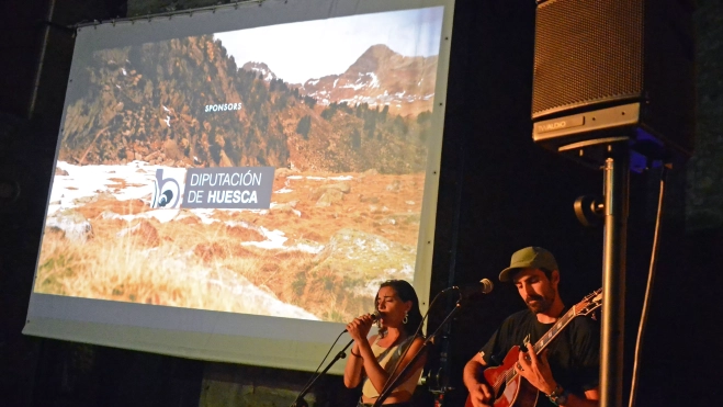 La película de Canción maldita se iniciaba en un embalse de Mediano prácticamente vacío que alertaba ya sobre el cambio climático. En la ascensión, además de López de Haro y Rulló, le acompañó la cantante aranesa, Alidé Sans, que no ha podido estar en Benasque. En su lugar ha estado, la joven catalana Joana Jové, que ha puesto voz a la guitarra de Mestre para versiones de canciones inspiradoras “que me transportan a la montaña o tocan aspectos ligados a Soul Mountain” y que fueron el núcleo de la segunda parte del recital. Oh My Love, de John Lennon, Redemtion song, de Bob Marley, Little Wing, de Jimi Hendrix o Gob Bless the child, de Billie Holliday, han sido algunos de los temas elegidos para reencarnarse en el escenario en la guitarra de Jordi Mestre y la voz de Joana Jové, que también incluían otros más personales e íntimos, como Pare, de Joan Manuel Serrat, y Déjame vivir, de Pau Donés.