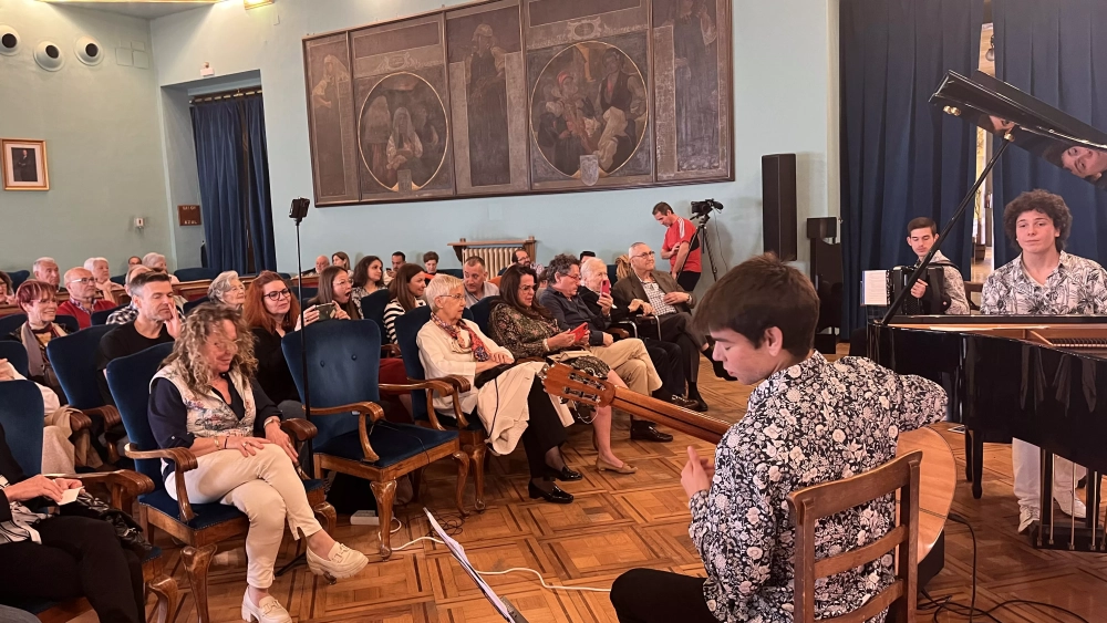 En un entrañable acto en el Casino de Huesca, el público ha quedado cautivado por tres jóvenes músicos que han desplegado su talento para honrar a Mariano Mairal Marín, destacado empresario, músico y ex primer teniente de alcalde de la ciudad. Bajo el nombre de TheSkullTrio 'Black & White', el nieto de Mariano, Fernando Gascón al piano, junto con Nicolás Florea en el acordeón y Asier Candial en la guitarra, se han presentado ante la audiencia en su segunda actuación pública.