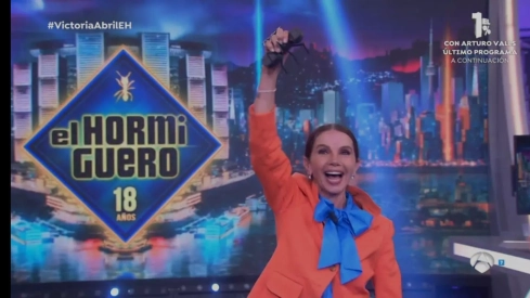 Abril apareció en el plató con el trofeo diseñado por Isidro Ferrer en la mano y abrazó con fuerza al presentador. "Vaya hostia me has dado con la hormiga", exclamó el presentador, divertido.