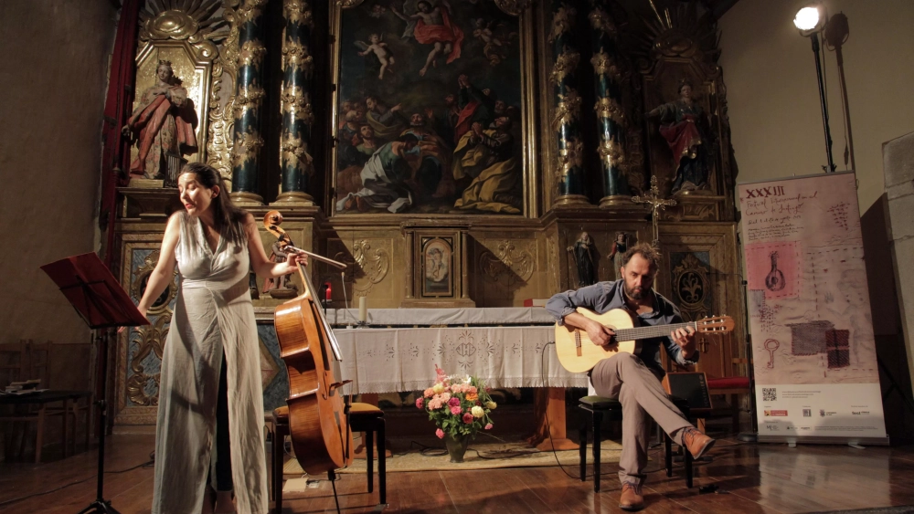 La iglesia de Santa Cilia de Jaca acogió la noche del jueves un nuevo y brillante concierto del XXXIII Festival Internacional en el Camino de Santiago que organiza la Diputación de Huesca. Zaruk está formado por su cofundadora Iris Azquinezer, cellista y compositora, y Rainer Seiferth, guitarrista, vihuelista, arreglista, compositor y la otra parte del dúo Zaruk. Nacidos como dúo en 2016, el estreno de ‘Agua’ se interrumpió por la pandemia y lo pudieron hacer en otoño de 2020, “aunque desde entonces ha cambiado mucho, ya que variamos canciones, arreglos e instrumentación”, por lo que llegó al festival con nuevos bríos y aires renovados.