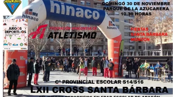 Alrededor de 350 atletas van a participar en el LXII Cross de Santa Bárbara, organizado por el Hinaco-CAM, que se celebra este domingo en Monzón dentro del programa festivo de la ciudad. La competición tiene como aliciente añadido que es al mismo tiempo Campeonato Provincial, individual y por equipos, para las categorías Sub-14 y Sub-16, dentro de los Juegos Deportivos en Edad Escolar del Gobierno de Aragón. En ambas categorías habría que remontarse a bastantes años atrás para encontrar el gran número de inscritos que se han registrado este año.