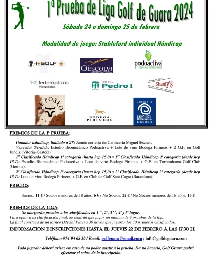 Comienza en Golf de Guara la Liga Guara 2024, tan esperada tanto por socios como por no socios. Este año se vuelve a contar con el patrocinio de Bodega Pirineos, Carnicería Miguel Escuer, Federópticos Pérez Bolea, Gescolvi Asesoría Fiscal, Hotel Pedro I, I+Golf, Peluquería Mixta Shanty´S, Podoactiva Podología y biomecánica y Taberna El Fosko.