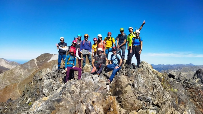 El pico de Pondiellos está muy cerca del collado y mientras nos reagrupamos algunos del grupo alcanzan la cima cercana. El collado está muy alto a 2.812 metros, y se puede observar que en la vertiente norte se ha depositado una capa de nieve de la fría jornada del viernes, que se ha transformado en hielo a esta altitud; habrá que subir esas canales con más cuidado cuando asoman restos de hielo y nieve donde el sol no ha llegado aún. Cuando alcanzamos la cumbre de la Aguja de Pondiellos la vista de lo que sigue hacia el Garmo siempre impresiona, parece impracticable, si no fuera porque se ve a dos montañeros que bajan con mucho cuidado pudiendo comprobar en la brecha que lo separa de la Aguja que con un punto de vista cercano se suaviza un poco la inclinada subida. No obstante, hay que trepar tanteando las rocas esquistosas. Por fin se tiene a la vista la cumbre del Garmo, el segundo tresmil de la jornada, lleno de montañeros y corredores de montaña diseminados por el espacio estrecho de la cima. Pronto nos disponemos a bajar al collado de Argualas que lo separa de la cresta de los picos de Algas, dejando atrás la gran ladera meridional del Garmo con las marcadas sendas en zetas, que está llena de coloridos ascensionistas.