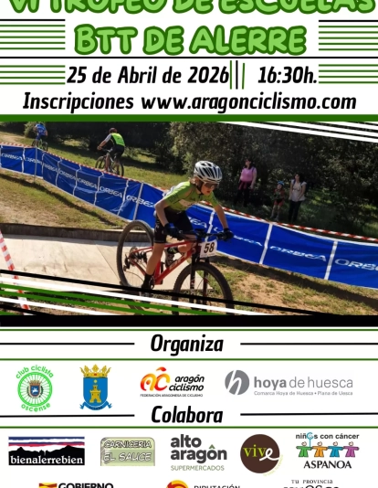 Este sábado se celebra el VI Trofeo Escuelas de BTT en Alerre, prueba organizada por el Club Ciclista Oscense y que cuenta con el apoyo del Ayuntamiento de la localidad, así como la Asociación Deportiva Alerre por el respaldo de sus voluntarios, que hacen posible sacarla adelante y los patrocinadores que han mostrado su fidelidad durante las ediciones que se han llevado a cabo, y hacia quienes la organización muestra su agradecimiento.