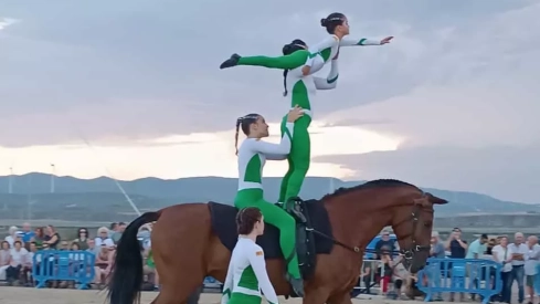 Las volteadoras del equipo de volteo Hípica Ntra. Sra. De Salas de Huesca dirigido por su entrenadora, Laura Ortiz; Claudia Ayuda, Eva Ollés, Lucía López, Laura Calavia, Candela Vidal y Clara Atarés junto con su Longueur o Conductor de cuerda Alejandro Bueno y la estrella del equipo su Caballo Zeus, hicieron una exhibición en las fiestas patronales de Gurrea de Gallego en el espectáculo de volteo cosaco de Florin Harabor especialista en volteo cosaco y acrobacias a caballo.