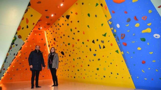 El alcalde de Barbastro, Fernando Torres, y la concejal de Deportes, Pilar Abad, han visitado la actuación realizada, que ha supuesto una inversión de más de 46.000 euros, de los que 35.211 se han destinado a la adecuación de la Sala Búlder y otros 11.298,69 euros a su equipamiento.