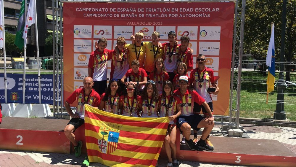 La primera gran alegría del fin de semana la ha conseguido la selección aragonesa de categoría Cadete que, tras los resultados obtenidos en las competiciones masculinas y femeninas del sábado y el relevo el Triatlón por relevos mixtos disputado el domingo, se ha alzado con una histórica medalla de bronce, sin duda el hito más importante del triatlón escolar aragonés hasta la fecha. Los deportistas que han conseguido la hazaña han sido Candela Puch, Julia Manso, Lucia Sancho, Eva Izquierdo, Noupa Sancho, Carlos Pintanel, Adrián Gracia, Alejandro Gracia y Ancor González. La selección cadete solo ha sido superada por la Comunidad Valenciana y Galicia, finalizando por delante de otras potentes comunidades autónomas como Cataluña, Madrid, Andalucía etc.