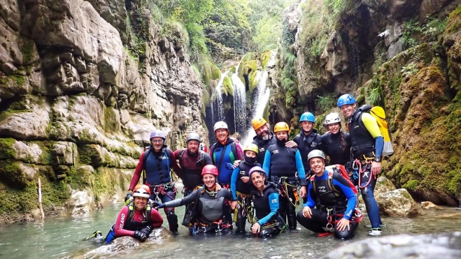 Pronto llegamos a la cabecera, donde comenzaba la surgencia, el agua cristalina y gélida nos dio la bienvenida. El contraste fue inmediato en el primer salto: el frío que recorría el cuerpo se veía compensado por los rayos de sol que, de vez en cuando, se colaban entre las gorgas, creando destellos de luz sobre la roca húmeda. Para combatir la sensación heladora, nada mejor que unas risas y unos bailes improvisados que terminaron por contagiar a todo el grupo.