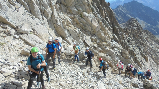 La Diagonal es un corredor de cascajo, roca suelta y gran inclinación, que nos hace poner las manos en más de una ocasión, y por eso nos colocamos los cascos para proteger nuestras cabezas. El ritmo es suave pero preciso evitando la caída de rocas...
