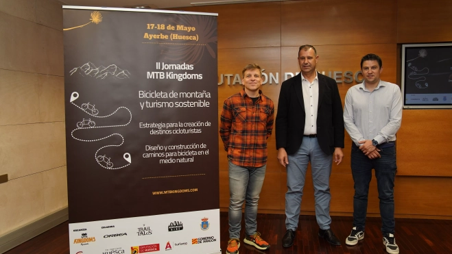 El alcalde de Ayerbe, Antonio Biescas, junto con el diputado de Turismo, Sergio Serra, y Javier García González, en representación de la Asociación MTB Kingdoms-Pyrenees, han presentado este martes en la Diputación Provincial de Huesca estas jornadas.
