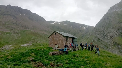 Pero esta primera parada, además de para coger fuerzas y acabar de despertarnos, nos permitió contemplar el valle y las cumbres y con estas magníficas vistas, pudimos explicar las peculiaridades de la montaña: relieve, clima, y otras características que definen el ecosistema alpino. También quedo claro que la excursión iba a durar más de lo previsto, por el interés y las preguntas de los asistentes y las detalladas explicaciones del guía botánico (el concepto “tres minutos”, previamente pactado para cada explicación, no acabó de calar y fue objeto de bromas durante toda la ruta).