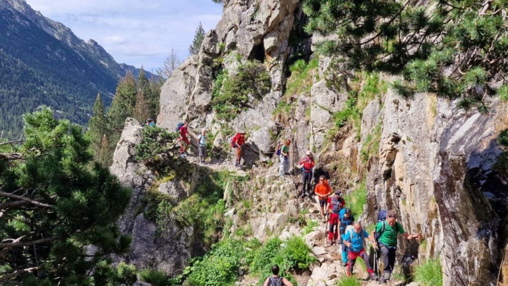 El sábado, sorteados los cierres de tráfico de la Quebrantahuesos, nos reuníamos en los Baños de Panticosa un grupo de integrantes del Club de Montaña Nabaín y del Club Atlético Sobrarbe. Chubasqueros, piolets, crampones y todo lo necesario para pasar dos días en la montaña ocupaban las mochilas, que se ultimaban delante del refugio de la Casa de Piedra. Diecisiete personas participaríamos en esta actividad, en la que pretendíamos transitar entre los macizos de los Infiernos y Balaitús hasta Sallent, y que tuvimos que ir adaptando a las exigencias de la montaña.