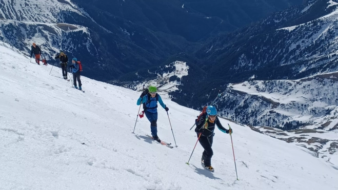En la cresta del gran collado se observa de cerca la gran vertiente sur de la montaña, que impone al ver que la parte alta tiene mucha inclinación en torno a unas rocas que afloran. Son más de seiscientos metros de desnivel que a base de amplias zetas se van salvando. La mayoría, al comienzo de la zona de más inclinación, pasamos a crampones cargando los esquís, otros continúan con cuchillas ya que la huella de ascenso está bien trazada.