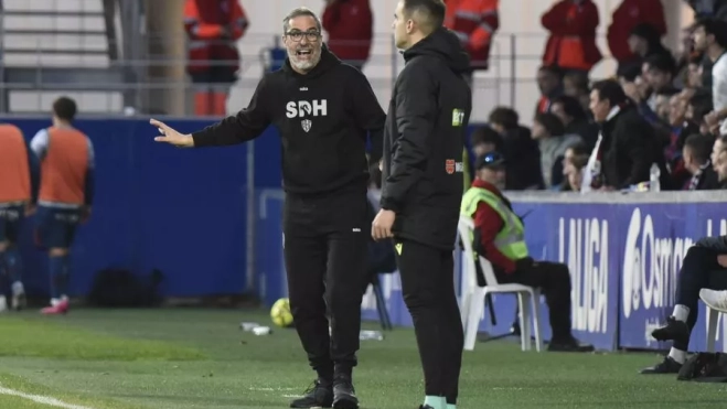 El técnico del Huesca asegura que los primeros 25 minutos han sido "muy buenos aun con el 0-1", "los mejores desde que estamos en el banquillo, pero el 0-2 nos ha hecho daño". "En la segunda parte, con espacios no hemos podido parar esas contras. No podemos permijtir que nos transiten con esa facilidad".