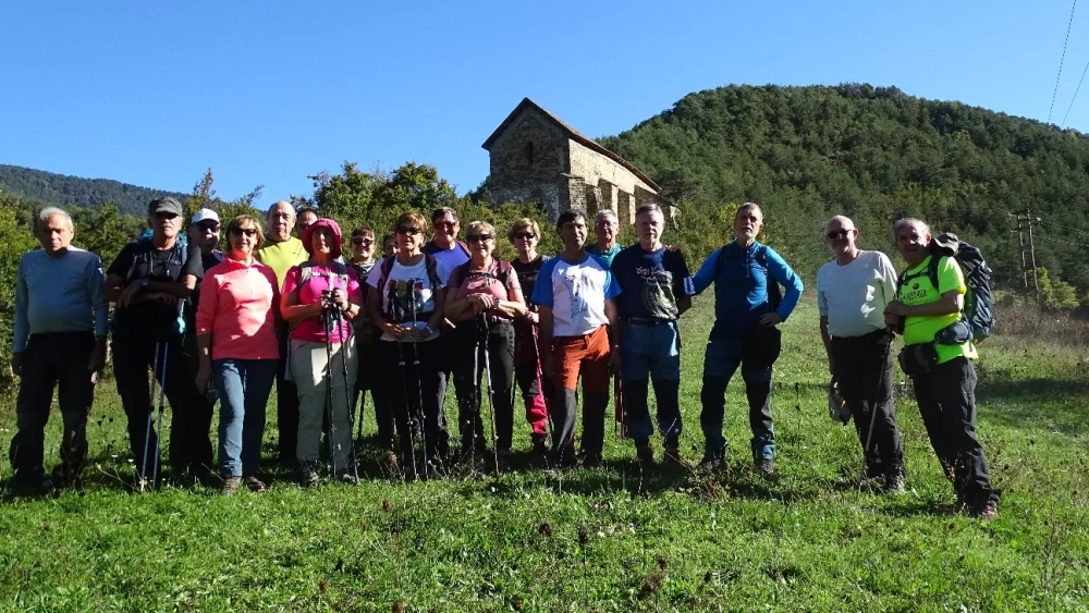 Tras un breve descanso comenzamos la bajada hacia Echo por una senda bien empinada que retrasó algo la marcha por la humedad de todo el bosque, hasta llegar al barranco de San Juan que transitamos unos cientos de metros y del que salimos a la derecha por senda bien marcada y que en un corto tramo de senda nos llevó hasta la ermita de la virgen Escagües donde se hizo parada y reagrupamiento general.
