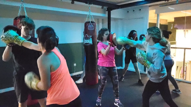 En el espacio dedicado al boxeo, Jiji Montoliú, que compite como púgil, dirige la clase con seis alumnos. Crochets, ganchos y repeticiones se repiten al ritmo de la música. Sudor, sonrisas y dinamismo en este gimnasio donde los sacos y los guantes se citan.