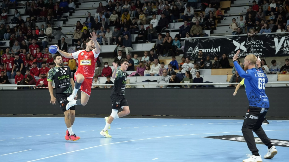 Bada Huesca se encontraba con una doble dificultad en los primeros compases del partido. Bathco Balonmano Torrelavega ha exhibido su gran estado de forma en un arranque poderoso después de que Artur Parera abriera el marcador en apenas 50 segundos. Los de Jacobo Cuétara han activado su balonmano rápido y poderoso con tres goles de Prokop, Javier Muñoz y Álex Rubiño. Mucha pólvora. Ahí tenía que aparecer el más enchufado, Miguel Malo con el primero de sus cinco de este periodo, pero el esloveno repetía en dos ocasiones para inugilizar la inspiración de Adriá Pérez y Charly Pérez. Martillos pilones obligaban a Nolasco al primer tiempo muerto (7:30) con 4-8.