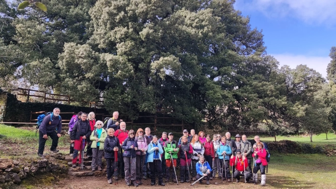 La temperatura es muy agradable y aprovechamos para comentar la suerte de que podamos disfrutar de un buen tiempo teniendo en cuenta que las previsiones meteorológicas no eran las más favorables. Tras el café nos acercamos para contemplar la imponente y centenaria carrasca de Lecina (Carrasca de Carruesco), reconocida como el Árbol Europeo del Año 2021. Un triunfo de la naturaleza, muy visitada y perfectamente conservada. Con seguridad que guardará interesantes historias entre su ramaje.