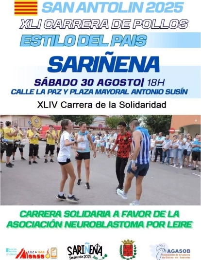 Con motivo de celebrarse las fiestas patronales de Sariñena en honor a San Antolín, el próximo sábado día 30 se disputará la XLI edición de su tradicional “Carrera pedestre al estilo del país”, que este año coincide con la “XLIV Carrera pedestre de la Solidaridad”. Las carreras comenzarán a las 18 horas con las pruebas infantiles y a continuación la absoluta.