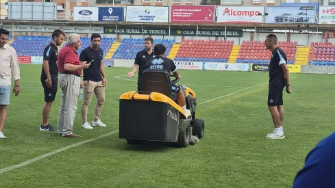 El Huesca-Castellón de este sábado ha dejado una nota curiosa antes de empezar. A poco menos de 40 minutos para la disputa del partido, varios miembros de la expedición del Castellón han cogido la cortacésped para arreglar varias imperfecciones del terreno de juego de Pinilla, el estadio del CD Teruel.
