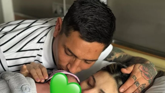El propio jugador ha subido este martes una fotografía a Instagram de su mujer con el bebé recién nacido, al que le ha tapado la cara con un corazón de color verde laurentino -y bético- para guardar su intimidad.