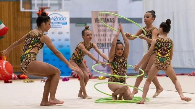 En cuanto a los conjuntos, van dos alevines para hacer ejercicios con cinco aros. El primero formado por Anahi González, Diana Cretu, Georgina Morales, Loreto Marco y Luna Jin. Y el segundo con Carla Bosque, Valeria Lalueza, Vera Izquierdo, Yaiza Cortés, Sara Frontons y Lucía Borges. Y también va un conjunto infantil Nacional Base, con un ejercicio de cinco pelotas, con Valeria Martínez, Julia Sistac, Ainielle Ramos, Ana Figueras, Carlota Gistau, Carlota Armisén, Itziar Parra y Adriana Ollés.